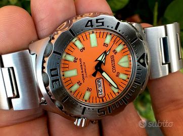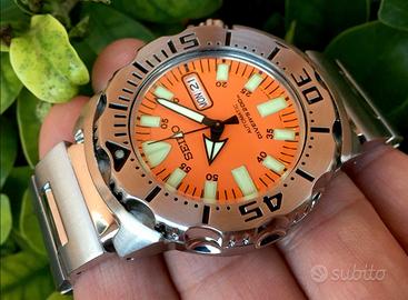 diver seiko scuba monster SKX 781 orange ref.7s26-0350.Orologio in splendide condizioni.Cassa acciaio da 42 millimetri ad esclusione della corona di carica,data e giorno ad ore 3 OK,ghiera girevole 120 click perfettamente funzionante,fondello a vite ,corona doppio scatto a vite ok ,movimento originale automatico marcato seiko 7s26C perfettamente funzionante e con buona tenuta del tempo e riserva di carica,non possiedo scatola e garanzia.