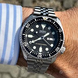 Bellissimo Seiko SKX 007, anno 1997 prima serie, quadrante e inserto ghiera virati, data inglese/numeri romani, perfettamente funzionante e in buone condizioni generali, completo di scatola e tutte le maglie del bracciale . Nuove guarnizioni, è fornito con prova d’impermeabilità, il movimento automatico marcia bene e ha una discreta riserva di carica, la ghiera ruota fluida con scatti decisi . Rimango a disposizione per domande inerenti all’orologio . La mia richiesta è di 280 euro, NON scambio . Preferibile consegna a mano zona Cesena e Forli, spedisco in tutta Italia. I miei feedback qui parlano per me, chiedo la stessa serietà . Grazie per l’attenzione.