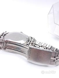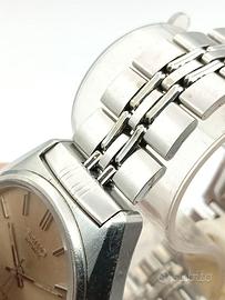 Viola Orologi presenta una rara declinazione cromatica del classico Seiko Automatic anni '70. Questo segnatempo si distingue per un quadrante dalla tonalità calda e magnetica, un vero pezzo di design dell'epoca d'oro dell'orologeria giapponese. DETTAGLI E CARATTERISTICHE Quadrante: Spettacolare finitura Ambra Dorato Soleil in perfette condizioni. La lavorazione a raggio di sole crea riflessi dinamici che virano dal miele al bronzo a seconda dell'inclinazione della luce. Indici e Sfere: Indici a bastone applicati in acciaio con inserto nero a contrasto e lancette "Dauphine" tronche, per un'estetica pulita e una leggibilità impeccabile. Movimento: Meccanico a carica automatica Calibro Seiko 6118A (17 rubini). Movimento di manifattura rinomato per la sua proverbiale robustezza e precisione. Cassa: Acciaio inossidabile da 37mm (esclusa corona), con finiture lucide e satinate ben conservate che mantengono i volumi originali. Movimento: Meccanico a carica automatica Calibro Seiko 6118A (17 rubini). Un movimento di manifattura celebre per la sua estrema robustezza e precisione nel tempo. Bracciale: Originale Seiko in acciaio a maglie ripiegate, perfettamente integrato e coerente con la referenza. Funzioni: Ore, minuti, secondi centrali e datario a ore 3 con funzione di scatto rapido. CONDIZIONI E PRESTAZIONI L'orologio vanta un quadrante intonso e privo di difetti, cuore pulsante di questo pezzo da collezione. Il movimento è marciante e pronto all'uso quotidiano. Il vetro esalite bombato esalta la tonalità ambrata, donando una profondità cromatica eccezionale. Disponibile subito presso Viola Orologi.