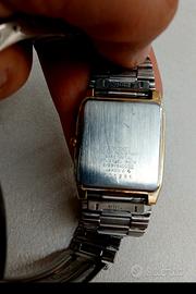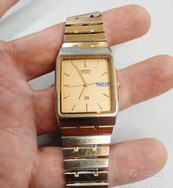 Vendo Seiko SQ Quartz in acciaio, modello vintage anni '80 con cassa a forma di "tank" e bracciale originale integrato. Movimento al quarzo e indici a bastone. Visualizzazione di giorno e data a ore 3. Funzionante e quadrante in buone condizioni estetiche. Unici difetti l' usura della placcatura che risulta sbiadita e normali graffietti superficiali da utilizzo.