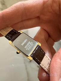 Vendo splendido orologio Seiko Classic (referenza SWR066), un pezzo di estrema eleganza che richiama l’iconico design "Tank". Perfetto per chi cerca un accessorio senza tempo, formale e raffinato. L'orologio è in condizioni eccellenti (pari al nuovo), come visibile dalle foto originali allegate. Caratteristiche principali: • Marca: Seiko • Modello: Classic / Essentials • Referenza: SWR066 (Calibro 4N30) • Movimento: Quarzo giapponese ad alta precisione. • Cassa: Acciaio inossidabile con finitura dorata (Gold Tone). • Dimensioni: 19 x 21 mm (ideale per polsi femminili, molto sottile ed elegante). • Quadrante: Champagne con texture centrale e indici dorati. • Vetro: Hardlex (minerale temperato resistente ai graffi). • Cinturino: Pelle di vacchetta marrone con stampa coccodrillo e fibbia originale logata Seiko. • Dettagli di pregio: Corona impreziosita da un cabochon nero. • Resistenza all'acqua: 3 ATM (30 metri). Condizioni e Corredo: L’orologio è perfettamente funzionante. Il cinturino è l'originale Seiko in condizioni impeccabili. Contattatemi per qualsiasi informazione o foto aggiuntiva.