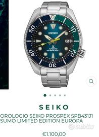 Vendo Seiko Sumo Prospex Limited Edition SPB431J1, automatico , 45mm, calibro 6R35, full set, riserva di carica 70 ore, impermeabilità 200 metri, bracciale in acciaio antigraffio e cinturino in gomma blu, provvisto anche di carica manuale, like new, indossato pochissime volte