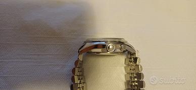 Questo seiko bell matik è splendido quanto raro, é il primo svegliarino automatico a rotore centrale prodotto dal 66 al 68, cassa 39mm. movimento giapponese di manifattura 4006a 27 jewels, ben funzionante, da non confondere col piu diffuso e successivo 17 jewels, ipnotico quadrante antracite soleil con indici e lancette luminescenti, disco periferico della sveglia regolabile con la corona a ore 3 che serve anche per la sua carica, per regolare ora e giorno della settimana, la data si regola premendo il tasto a ore 2, il quale sollevato aziona la sveglia, vetro hardlex con leggeri segni dovuti al normale utilizzo come del resto anche la cassa, mai lucidata, che ha spigoli vivi, bracciale jubilee con clasp seiko lunghezza fino a circa 19 cm. in + che buone condizioni generali vista l'età, e tranne il bracciale, tutto originale senza scatola ne garanzia