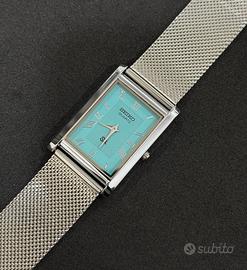 Vendesi bellissimo SEIKO TANK pari al nuovo. Cassa e cinturino in acciaio. Quadrante colore turchese. Batteria nuova.