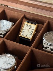 Vendo questo elegante Seiko Tank della mia collezione per cambio progetto, misura 38mm sul polso, full set come da foto. Condizioni eccellenti, usano si e no 3-4 volte e poi custodito come in foto. Questo Seiko è esclusiva giapponese, non venduto in europa ma, coperto da garanzia globale. Preferisco incontro di persona, prova con mano e acquisto diretto, per ora non spedisco.