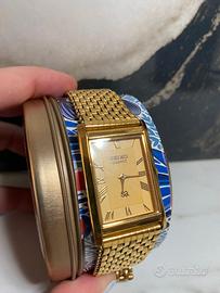 Vendo elegante Seiko Quartz in colorazione dorata, con cassa rettangolare e quadrante a numeri romani. L’orologio ha un design classico e raffinato, ideale per un look elegante o da collezione.