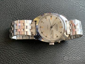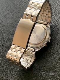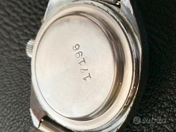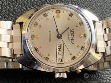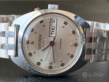 Raffinato e raro orologio sovietico degli anni 70 SEKONDA Automatic 25 Jewels con movimento meccanico automatico e cassa di 37 mm di diametro - orologio in buone condizioni estetiche che funziona alla perfezione - si segnala la presenza di un piccolo graffio sul vetro plastica ad ore 5 (visibile in foto) - bel quadrante argentato con indici applicati in rilievo e lancette nere - pulsantino ad ore 2 per la regolazione rapida della data - bracciale generico nuovo in acciaio di ottima qualità e di stile coerente con l’estetica e l’epoca dell’orologio adatto a polsi di qualsiasi misura - prezzo di vendita particolarmente ribassato in funzione del piccolo difetto segnalato sul vetro