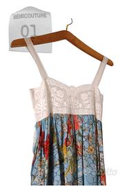 Splendida canotta Semicouture ideale sia per occasioni più casual che più formali come cerimonie. Il sopra si presenta con una fascia in pizzo floreale con scollo a cuore e bretelle, la parte del sottoseno con un tessuto floreale su sfondo azzurro, semitrasparente e asimmetrico. La vestibilità dal sottoseno diventa comoda e svasata. Presenti dei bottoni di chiusura sul retro. La taglia è 40, il prodotto è stato realizzato in Italia / made in Italy. Ottima fattura. Il tessuto è 100% viscosa per la parte posteriore e 85% cotone e 15% poliestere per la parte superiore. Non presenta difetti