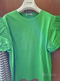 T-shirt verde con cartellino, bianca e fuxia torto