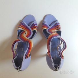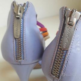 SERGIO ROSSI sandali n.38 Made in Italy, tallone chiuso con cerniera lampo (con cursore marchiato Sergio Rossi), tomaia in vera pelle multicolor (lilla, viola, rosso, arancione, crema), fodera e sottopiede in vera pelle, suola in vero cuoio.
