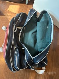 Ciao Vendo borsa vintage Sergio Tacchini originale Vintage . Anni ‘70/‘80. Condizioni: presenta segni di usura dovuta all’età e una macchia bianca come da foto ma non ci sono strappi o tagli evidenti e le zip e le cinghie sono integre e funzionanti. Pezzo da collezione