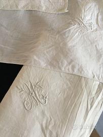 lotto fazzoletti d'epoca in cotone bianco con bordo operato in rilievo e siglati con la lettera M, ricamata a mano con stili differenti