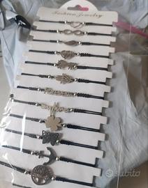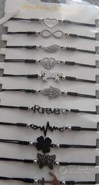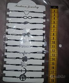 Set di 12 braccialetti con ciondoli a tema. - Ciondoli a forma di cuore, infinito, ala, cuore con battito cardiaco, unicorno, mano di Fatima, scritta Forever, battito cardiaco, quadrifoglio, farfalla, ancora e albero della vita. - Cordino nero regolabile. - Dettagli in metallo color argento.