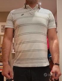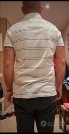 ⚪ Polo bianca con righe blu e marroni: fresca ed estiva, con logo ricamato.