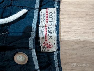 Bermuda a righe Cotton & Silk: Color blu navy con righe bianche. Tessuto leggero e fresco, vita elasticizzata con coulisse regolabile. Taglia M.