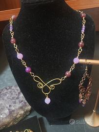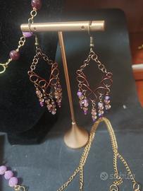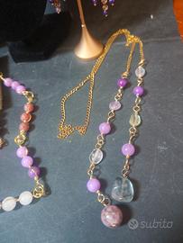 set tre collane, con bracciale,orecchini pietre, ametista,agata, vetro collana aperta da annodare collana con motivo centrale collana con pietre bracciale con pietre orecchini pendenti vetro pietre ametista lavanda,agata