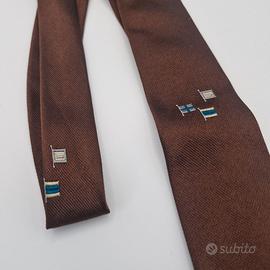 Cravatta marrone con bandierine ricamate, 100% seta, senza marchio ma manifattura italiana, punta 6,5 cm.