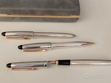 Set di tre penne in argento 925, con triplo marchio, della prestigiosa argenteria Zanolli di Brescia. Il set è composto da: 1 penna a sfera 1 matita a mine 1 penna stilografica. La conservazione è perfetta. L'argento può essere pulito con un normale prodotto per la casa. L'inchiostro di ricarica o le mine non sono fornite. Le foto rappresentano il bene così come venduto.
