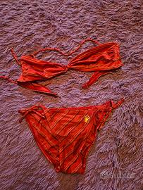 - rosso con righe dorate, marca Triumph, slip allacciati sui fianchi, reggiseno a fascia non imbottito