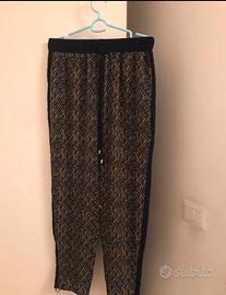 In ordine di immagini 1) pantalone nero cavallo basso vita con pence tessuto leggero elastico taglia unica veste una 42/46 2)leggings antracite taglia unica veste una 38/42 3) leggins nero con paillettes tessuto leggero e satinato elastico taglia unica (veste una 40/44) molto eleganti indossati si adattano a outfit per occasioni o casual molto versatili 4) pantalone con coulisse vita , tasche laterali , in tessuto leggero bei colori cachi nero e ocra , banda nera laterale lungo tutta la gamba , taglio dritto con caviglia più stretta , veste una 40/44 NON CHIEDERE DI INVIARE FOTO O INFO IN ALTRI CANALI, SE INTERESSATI SCRIVERE QUI