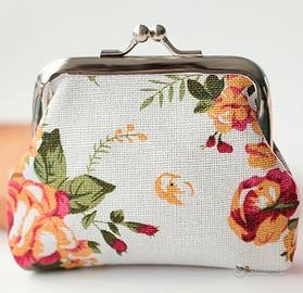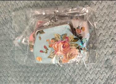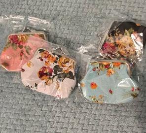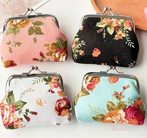 Grazioso set di quattro portamonete con chiusura a scatto, perfetti per organizzare le tue piccole cose. nuovi - Design floreale su sfondo rosa, azzurro, bianco e nero. - Chiusura metallica a scatto. - Tessuto resistente.