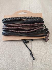 Vendo set di 4braccialetti da uomo stile Urban/vichingo,nuovi mai usati e ancora nella confezione originale."fashion jewelry" Colore:nero +marrone,misto corda e similpelle intrecciata. Effetto" polso pieno"molto bello. Chiusura regolabile con nodo. Perfetto come idea regalo o per completare un look casual/rock. Ne ho due pacchetti disponibili. Prezzo €8 l' uno, se li prendi entrambi €15.