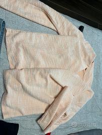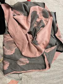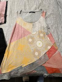 Set composto da 1 gonna in jeans, 1 gonna in jeans color nero taglia, 1 canotta, un foulard fantasia floreale, 1 cardigan trama rosa e bianco.