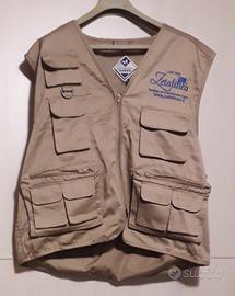 Gilet Multitasche Funzionale (Nuovo) color sabbia, nuovo e mai usato, ideale per lavoro o attività all'aperto. Presenta il logo personalizzato di una ditta, ma è un caporesistente e pratico