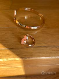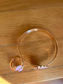 Set anello ( diametro 1,5 cm ) e bracierro rigido ( diametro 6 cm ) con quadrifoglio rosa.