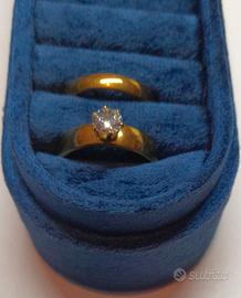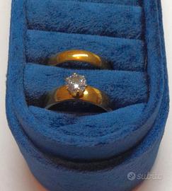 Bellissimo set costituito da un anello solitario con zircone sintetico molto luminoso e da una fede in acciaio inossidabile placcato oro 18 carati