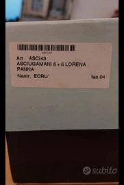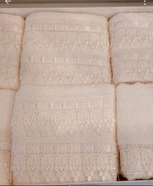Set asciugamani: 6 asciugamani 104x58 e 6 asciugamani 58x39 colore panna 100% cotone bordino con merletto, made in Italy Queen's house brand. Nuovi, mai utilizzati, in confezione originale. Spedisco anche senza il cartone originale.