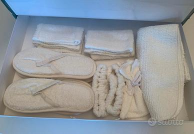 Vendo elegante set bagno completo in 100% spugna di cotone, colore bianco con inserti in merletto.