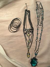 Collana 2 (Lunga): Catena lunga in tonalità scura con maglie ad anello e perline di vetro verde, con un grande pendente ovale color verde smeraldo.