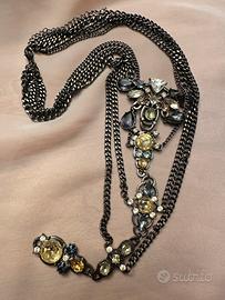 Collana 1 (Multistrato): Catene scure (gunmetal/nero) con pendente elaborato tempestato di pietre e cristalli nelle tonalità del giallo pallido, grigio fumo e bianco.