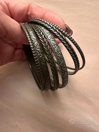 Bracciali: 6 bracciali a cerchio (bangle) in metallo scuro, con texture incisa (motivi a spiga/ foglia.