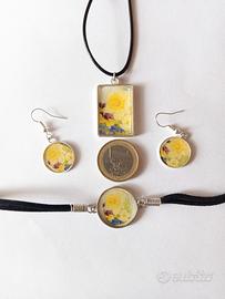 Set composto da: collana con laccio regolabile, braccialetto regolabile, orecchini tondi. Tutto il set è in resina decorata con l'immagine di fiori gialli.