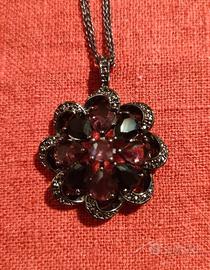 Set composto da collana e orecchini di Emanuel Ungaro by Avon. In metallo nero e pietre nere e viola. Nuovo nelle loro scatole originali. Nella mia vetrina vengono venduti anche separatamente.