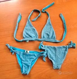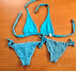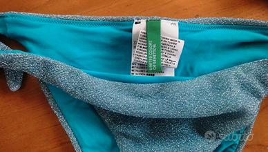 Set bikini a triangolo annodato completo di due slip taglia XS e reggiseno S. Colore turchese in nylon e lurex, marca United Colours of Benetton. Usato in ottime condizioni.