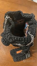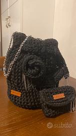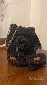 Un set pensato per chi non scende a compromessi tra stile e artigianalità: borsa a secchiello e portamonete coordinato, realizzati a mano all'uncinetto con fettuccia di cotone nero e base in pelle bordeaux. La rosa applicata sul fronte è lavorata interamente all'uncinetto, un dettaglio che racconta ore di cura e passione. Le frange in catene argentate aggiungono movimento e un tocco rock-chic, mentre la catena a maglie grosse completa il look con personalità. All'interno, la fodera in tessuto a fantasia geometrica colorata sorprende con un contrasto originale e vivace, perfetto per chi ama i dettagli nascosti. Versatile e capiente, si porta a spalla o a mano, dal giorno alla sera. 🖤 Colore: nero 🧵 Materiale: fettuccia cotone, base in pelle bordeaux 📐 Dimensioni borsa: 32 x 20 cm circa 👜 Set incluso: borsa + portamonete coordinato 🔒 Chiusura: a laccio 💫 Dettagli: rosa all'uncinetto, frange in catene argentate 🎨 Fodera: tessuto fantasia geometrica 🌿 Lavorazione: 100% fatta a mano all'uncinetto ⛓️ Tracolla: catena a maglie argento ✨ Stile: elegante / casual