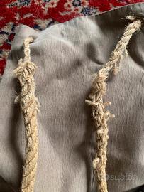 Set 2 borse e 1 zaino da aggiustare, per chi è in grado di sistemare e dare una seconda vita. Elenco i difetti come da foto: - zainetto di tela, cordone rovinato, andrebbe sostituito - borsa in sughero, segni di usura da utilizzo e annerimento sul retro - borsa grigia in finta pelle, gancio della tracolla da sostituire, taglietto su un lato e manca il copri botto uno sulla tasca davanti