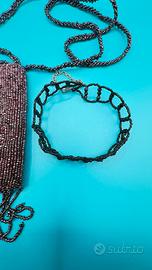 Set coordinato: borsetta in perline con frange + girocollo nero in perline con estensione. Usati, buone condizioni generali.