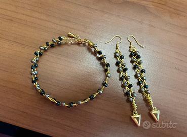 Bracciale e orecchini realizzati a mano in acciaio dorato e perline. Nuovo