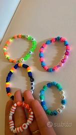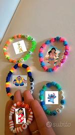 Cinque braccialetti colorati, ciascuno pensato per rappresentare un membro della famiglia attraverso un personaggio di Lilo & Stitch. Ogni braccialetto è realizzato a mano con perline abbinate ai colori del personaggio, creando un collegamento visivo e affettivo: