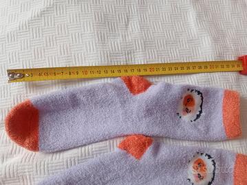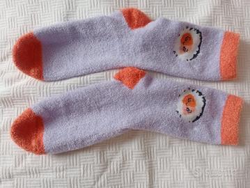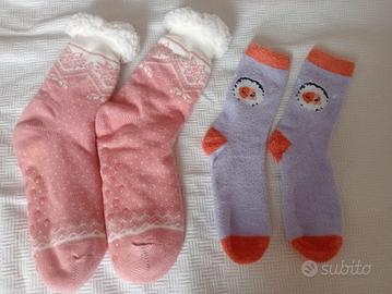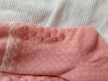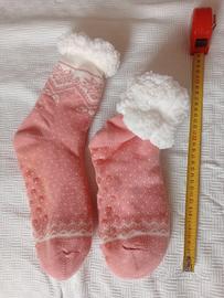 Il primo paio è rosa, con decori bianchi e antiscivolo, con interno in morbido pile, caldissimi.