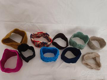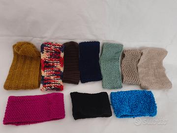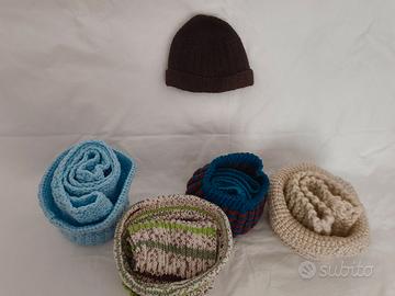 Set di accessori invernali fatti a mano, che include cappelli, sciarpe e fasce per capelli o scaldaorecchie lavorate a maglia e all'uncinetto.