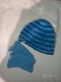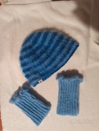 berretto invernale morbido e caldo realizzato all'uncinetto con filati mohair e lana, a righe azzurro e blu spazzolato per un effetto fluffy/fuzzy. guanti senza dita / manicotti in mohair 80% con volant. tutto nuovo mai indossato, realizzato a mano.