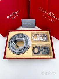 Vendo splendido set Salvatore Ferragamo, composto da: • cartellino Salvatore Ferragamo • 1 cintura in pelle (regolabile 110cm) • 2 fibbie intercambiabili, nei colori nero e argento • Elegante cofanetto Ferragamo • Shopping bag firmata Salvatore Ferragamo Condizioni: Nuovo, mai indossato. Ideale anche come regalo di classe! Taglia cintura: 110cm Regolabile (adatta alla maggior parte delle taglie, facile da accorciare) disponibili anche altre colorazioni e possibilità di acquisto in set.