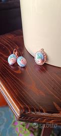Set composto da ciondolo e orecchini coordinati, ricamati interamente a mano. Una rosa delicata sboccia su un cielo celeste velato, impreziosita da una perlina avorio centrale e incorniciata da una base color rosa antico. Ogni punto è ricamato con cura e lentezza, per un risultato elegante, romantico e leggero da indossare. Perfetti per chi ama i dettagli fatti con amore o cerca un regalo speciale.