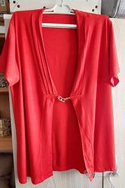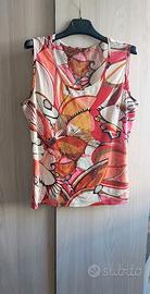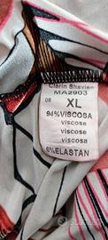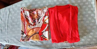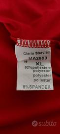 set della Clarin Shavien, tg XL, composto da: - canotta multicolore, con scollo tondo largo, in viscosa e 6% elastan, quindi elastica, morbida e comoda, anallergica, misure esatte spalle cm 38, larghezza cm 50, lunghezza cm 60; - maglietta rossa, maniche corte, aperta ma con catenella di chiusura sotto il petto, con plissè sui bordi sopra la catenella, tg XL, in poliestere e 8% spandex. Made in Italy. Usato qualche volta ma in condizioni perfette.
