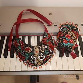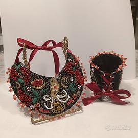 Materiali: tessuto, perline, filo dorato, raso, vera pelle